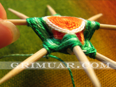 Ну вот, пора включать фантазию и, используя два плетения «розетка» и «квадрат» и разноцветные нити, плести свой неповторимый узор мандалы. Стоит только учесть тот момент, что нужно оставить примерно четверть длины палочек на заключительное плетение. Я взяла еще немного зеленых ниток и повторила плетение «розеткой». После чего приступила к заключительному плетению «пояс» — когда поочередно по кругу оплетается каждая палочка.